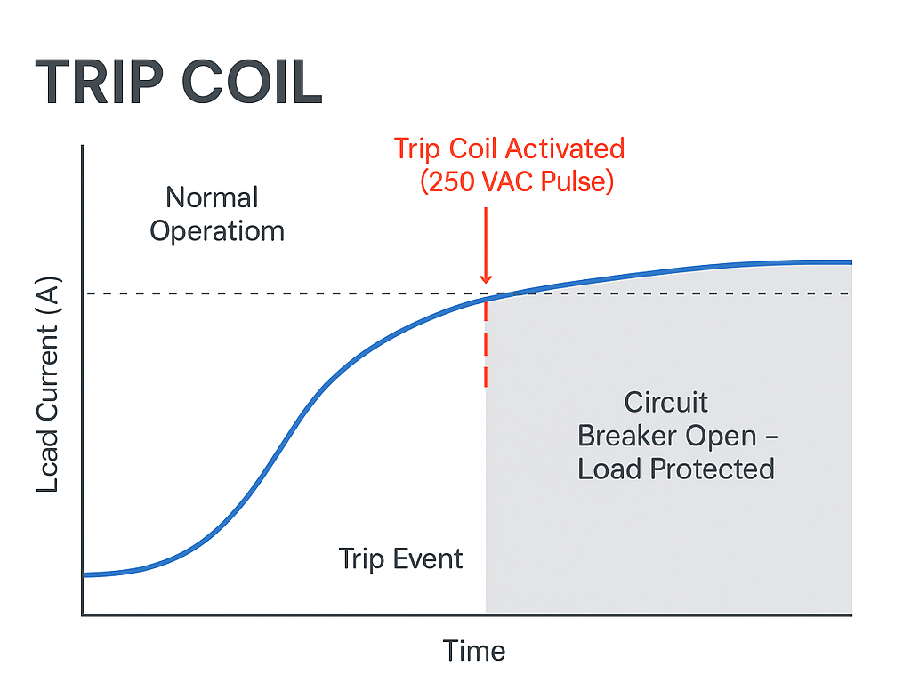The Trip Coil is an electromagnetic module integrated into the breaker housing and powered by an external control voltage (12 VDC, 24 VDC, 48 VDC, or 115/230 VAC).