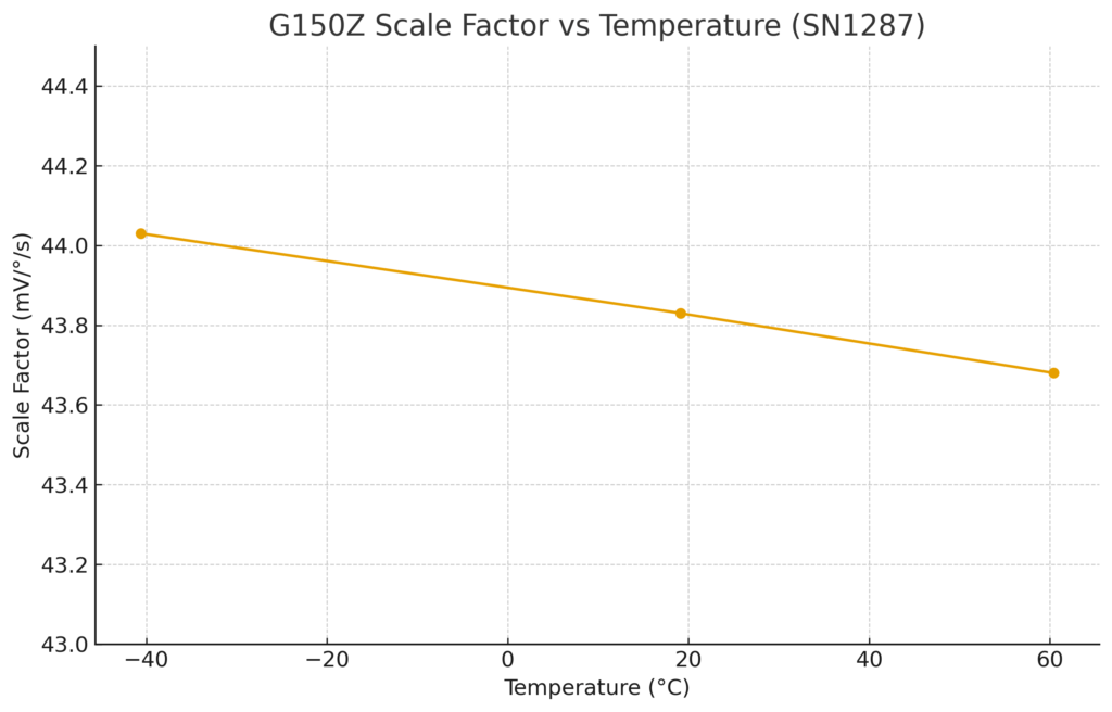 From the data, the scale factor varies only from about 43.68 mV/°/s to 44.03 mV/°/s across the full temperature range – a very small change. This indicates excellent thermal stability of the sensor’s sensitivity.