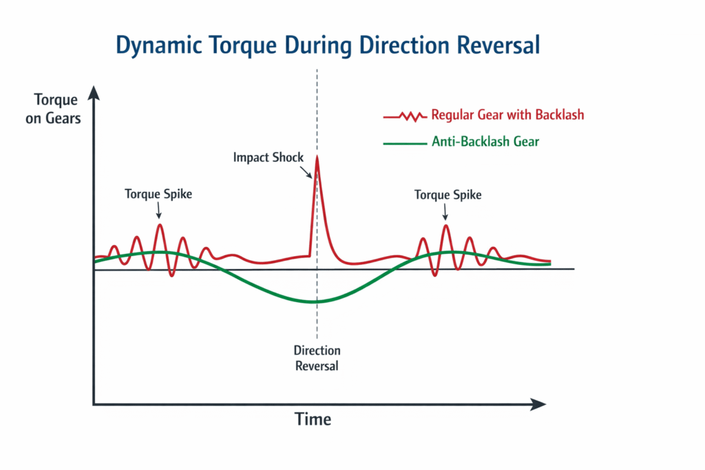 הגרף מציג את המומנט המועבר לשיני הגיר בזמן היפוך כיוון.