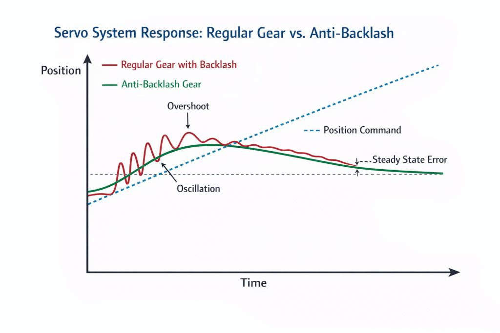 עם גלגלי Anti-Backlash (קו ירוק) המערכת עוקבת בצורה חלקה ויציבה אחרי הפקודה, עם פחות רעידות וסטייה.