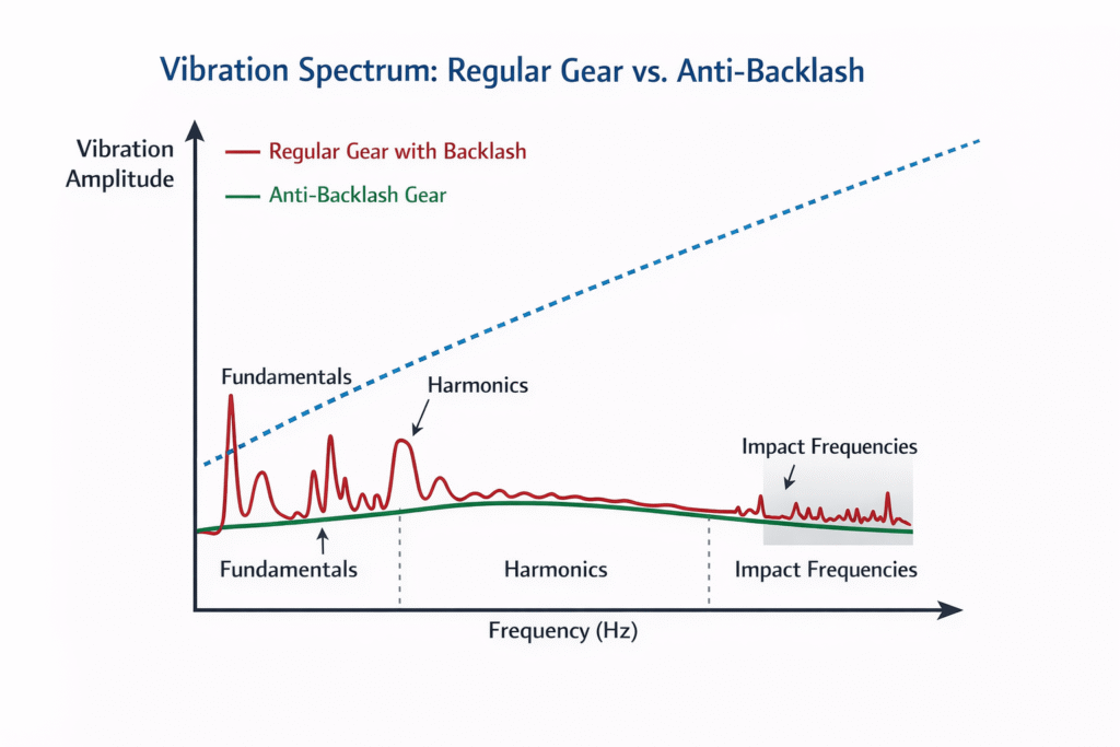 בגלגלי Anti-Backlash (קו ירוק) רמת הרעידות נמוכה וחלקה יותר, מה שמפחית רעש, עייפות חומר וכשלי מערכת.